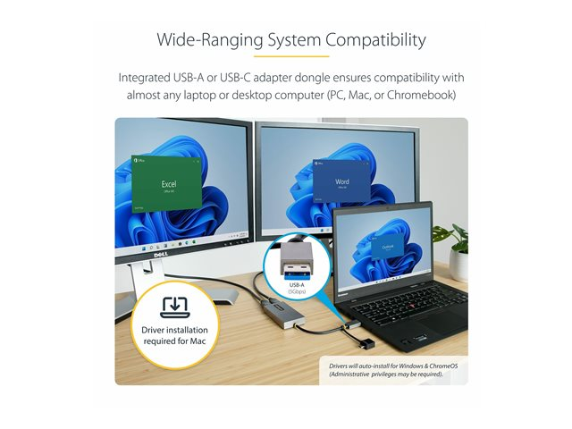 StarTech.com USB to Dual HDMI Adapter, USB A/C to 2x HDMI Monitors (1x 4K 30Hz, 1x 1080p), Integrated USB-A to C Dongle, 4in/11cm Cable, Windows & macOS
