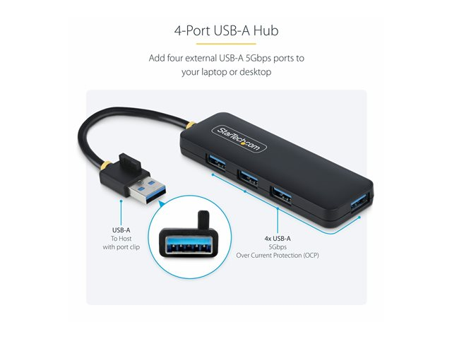 - Informasjon The 4-Port USB-A Hub from StarTech.com offers a seamless USB connectivity solution for various devices. This hub features four USB 3.2 Gen 1 ports, enabling quick data transfer while supporting multiple peripherals. Designed for desktop use, it incorporates a Plug-and-Play capability ensuring easy installation. Additionally, it is equipped with overload current protection for safe operation while maintaining a sturdy performance with a mean time between failures of approximately 24,000 hours. Built to withstand a range of environments, this hub operates efficiently in temperatures from 0°C to 40°C and offers compatibility with USB 1.1, USB 2.0, and USB 3.0 standards, making it a versatile addition to any workspace.
