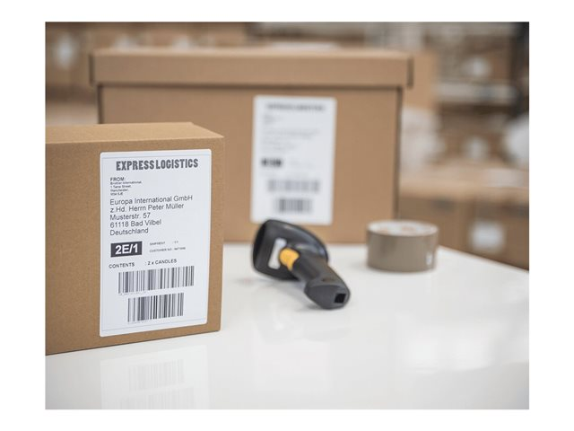 - Built-in cutter to create your own length labels using continuous rolls