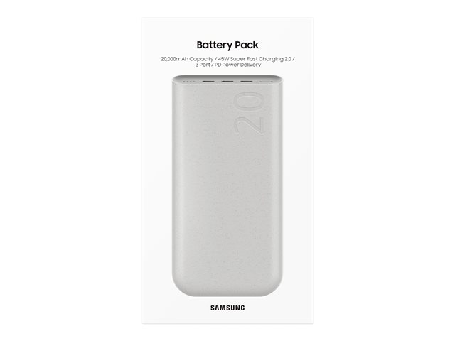 Produktbeskrivelse Samsung strømbank - 25 watt Produkttype Strømbank Farge Beige Hurtigladingsteknologi Fast Charge Batteri 20000 mAh Strømtilførsel 25 watt - Nedlastbare filer